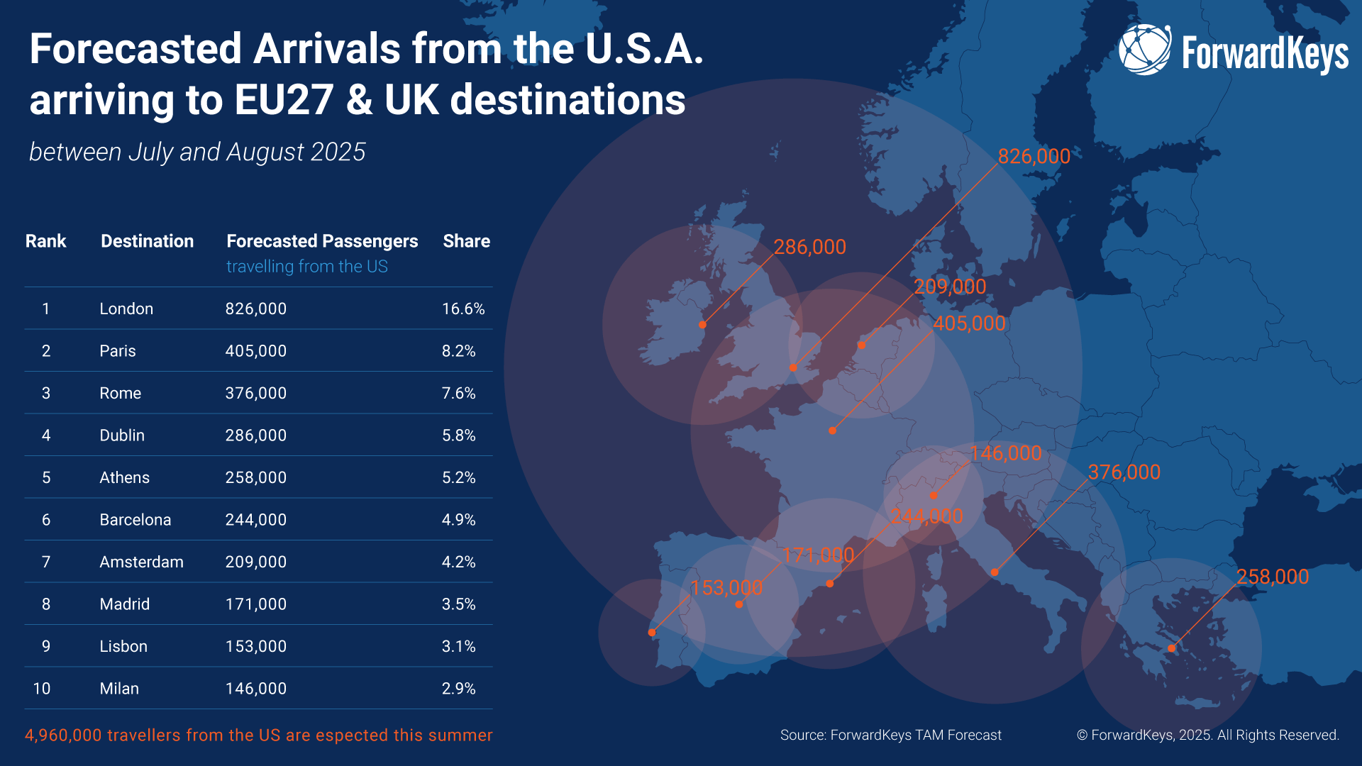 Η Αθήνα είναι στο top 10 με τους πιο δημοφιλείς ευρωπαϊκούς προορισμούς για τους Αμερικανούς ταξιδιώτες μεταξύ Ιουλίου και Αυγούστου 2025, σύμφωνα με προβλέψεις της ForwardKeys.