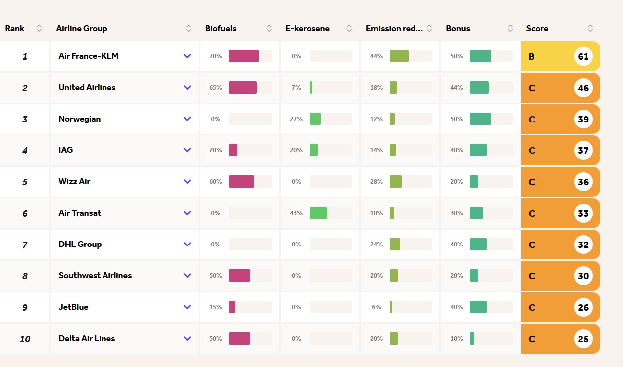 Οι αεροπορικές βαθμολογήθηκαν στις κατηγορίες A,B,C,D από το 0 έως το 100 με βάση τις μειώσεις των εκπομπών τους μέσω εναλλακτικών καυσίμων (SAF) και τα μερίδια τους σε προηγμένα και απόβλητα βιοκαύσιμα και ηλεκτρονική κηροζίνη.
